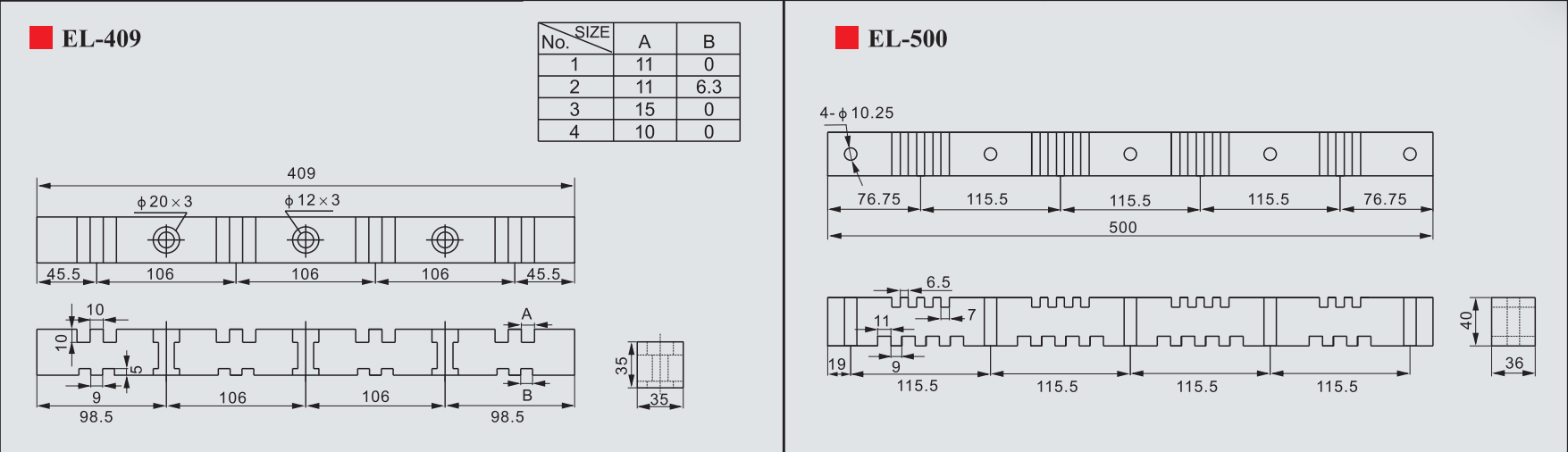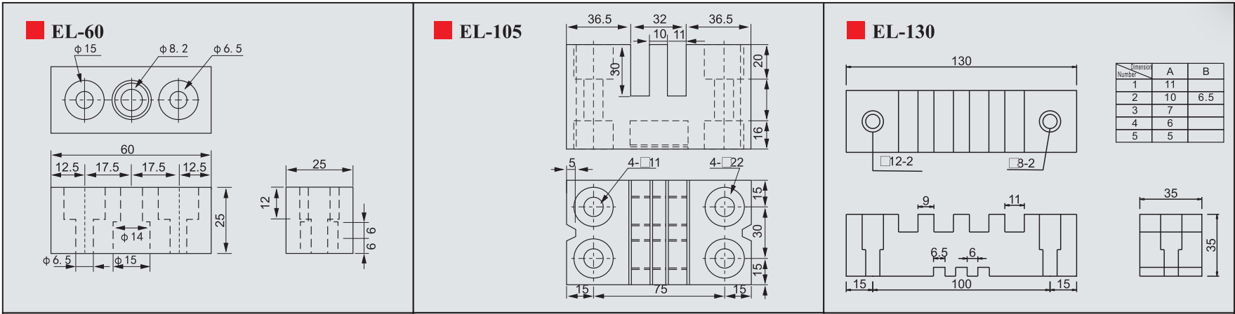 Sản phẩm gồm các mã: EL-130, EL-180, EL-210, EL-270, EL-295, EL-409, EL-500, EL-600, EL-800, được phân loại theo kích thước và khả năng chịu dòng/chịu lực, phù hợp cho nhiều loại tủ điện trung tâm và tủ điện công nghiệp.