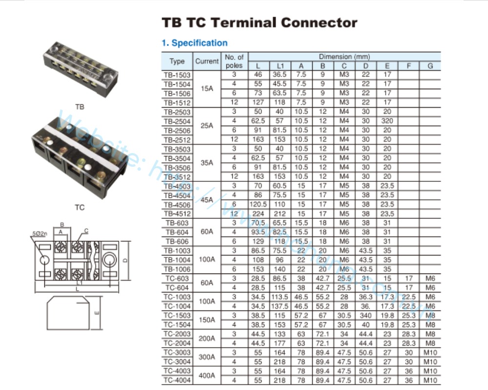 Cầu đấu điện dòng TB là loại cầu đấu nhiều cực dùng để nối dây nhanh chóng và an toàn trong tủ điện, bảng điều khiển và thiết bị công nghiệp. Sản phẩm có vỏ nhựa C chống cháy, chịu nhiệt tốt và bền bỉ, kèm nắp mica trong suốt giúp quan sát đầu nối bên trong. Mỗi cực đấu sử dụng vít siết chắc chắn, tiếp xúc đồng ổn định, chịu điện áp định mức 600V, đảm bảo truyền dẫn điện an toàn và tin cậy.