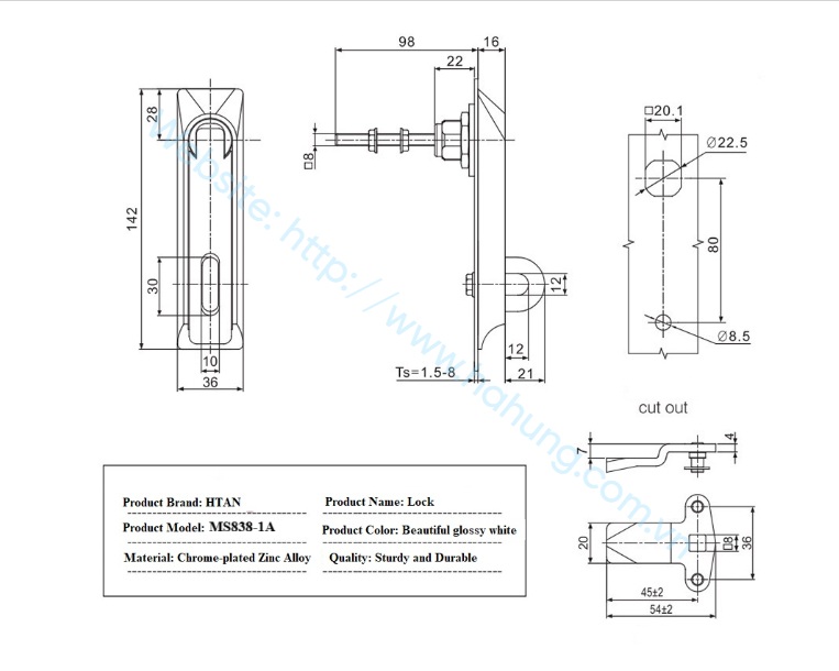 Khóa MS838-1A là dòng khóa phẳng móc rời chuyên dùng cho tủ điện, tủ điều khiển và các tủ kim loại công nghiệp. Thân khóa được làm từ hợp kim kẽm đúc mạ chrome sáng, kết hợp móc khóa inox giúp tăng độ bền và khả năng chống gỉ. Sản phẩm hỗ trợ độ dày cửa từ 1–10 mm, đạt chuẩn IP65 cho khả năng chống bụi – chống nước tốt. Khóa sử dụng cơ cấu móc rời linh hoạt, đảm bảo giữ cửa chắc chắn và an toàn trong môi trường làm việc khắt khe.